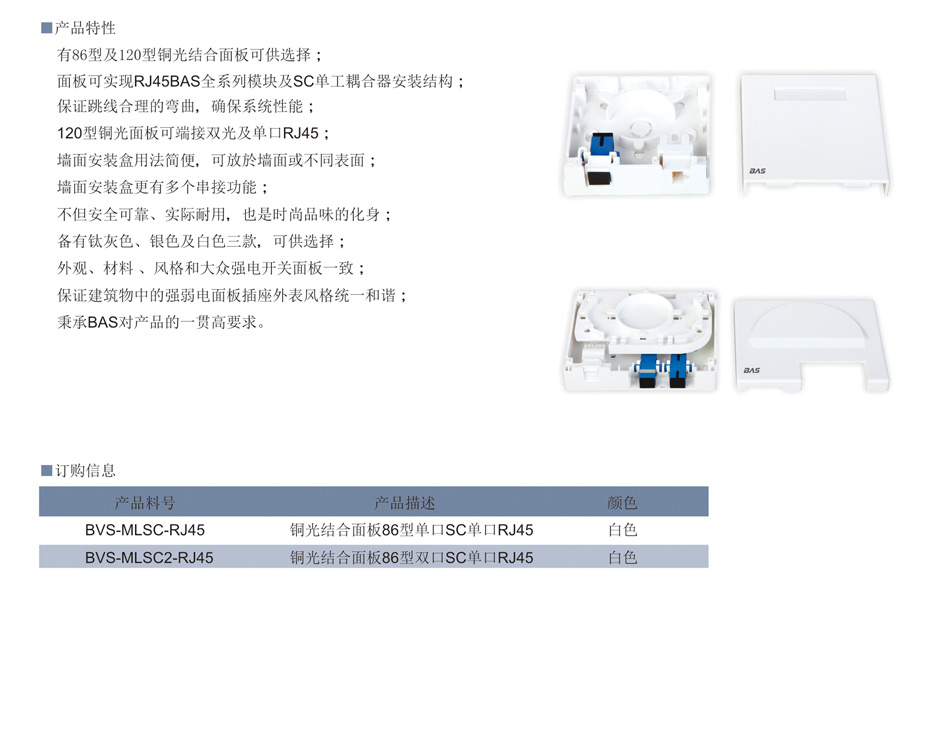 有86型及120型铜光结合面板可供选择;面板可实现RJ45BAS全系列模块及SC单工耦合器安装结构,保证跳线合理的弯曲,确保系统性能